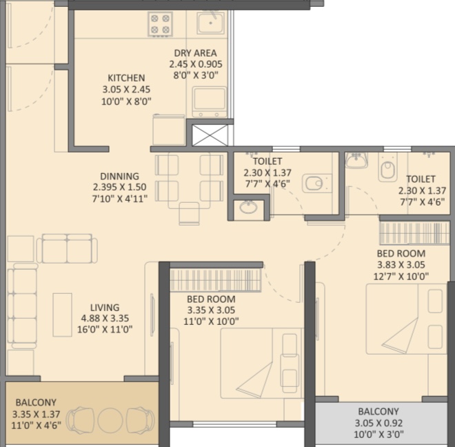 - 2BHK 808 SQ.FT