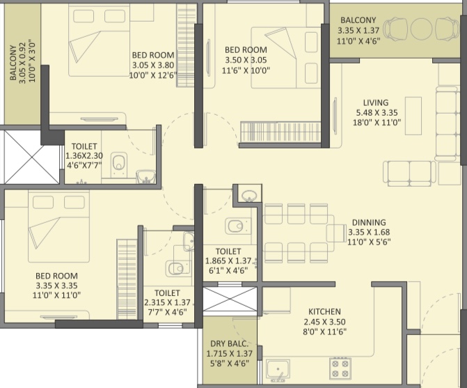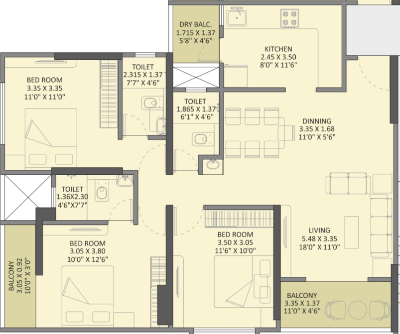 - 3BHK 1059, 1039 & 1033 SQ.FT